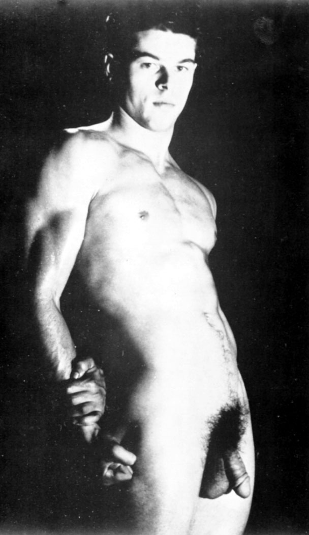 Besides having a good looking kisser (right), Zaro has a matching physique, as the two small photos attest. Rossi developed the build through weight training in various San Francisco health studios… and by taking an active part in an assortment of athletic pastimes. His endeavors have paid off in an unusually trim and sym- metrical physique, including a chest measurement of 47″ and a neat waistline of only 29″. At a height of 5’8″, he weighs 150 pounds. Note in particular the fine arm development, especially the length of the bicep muscle in the small photo on the bottom.