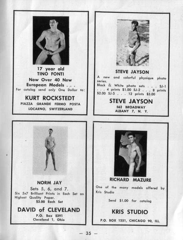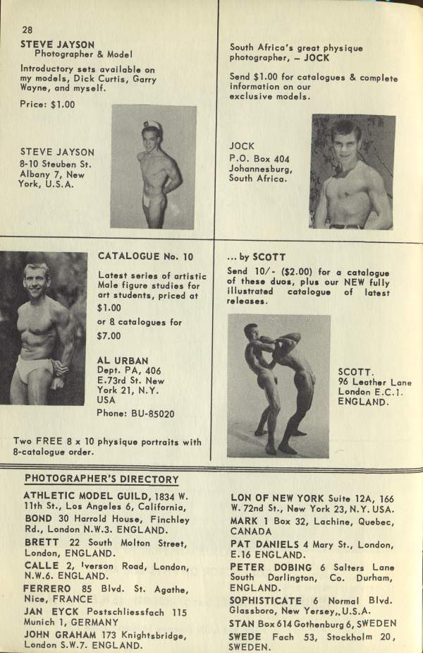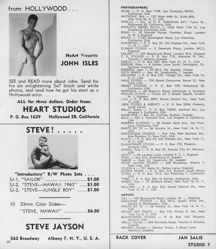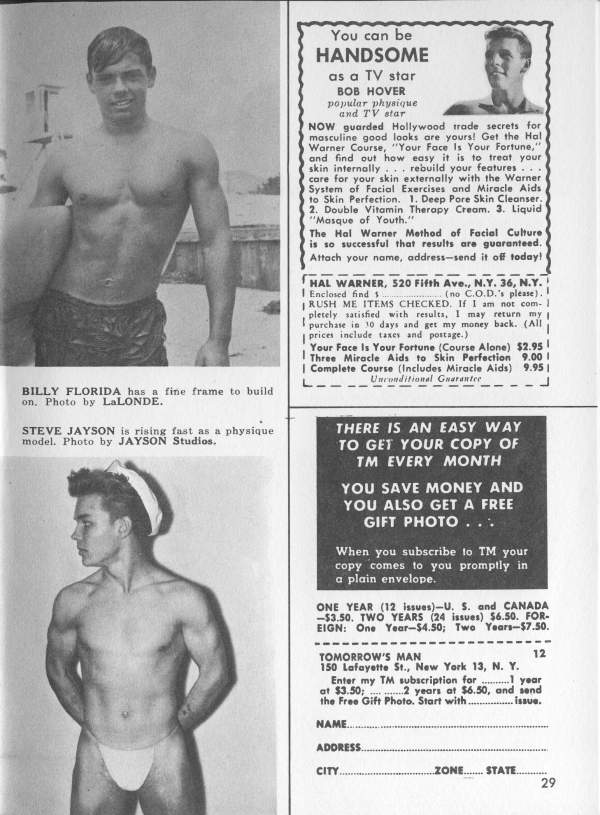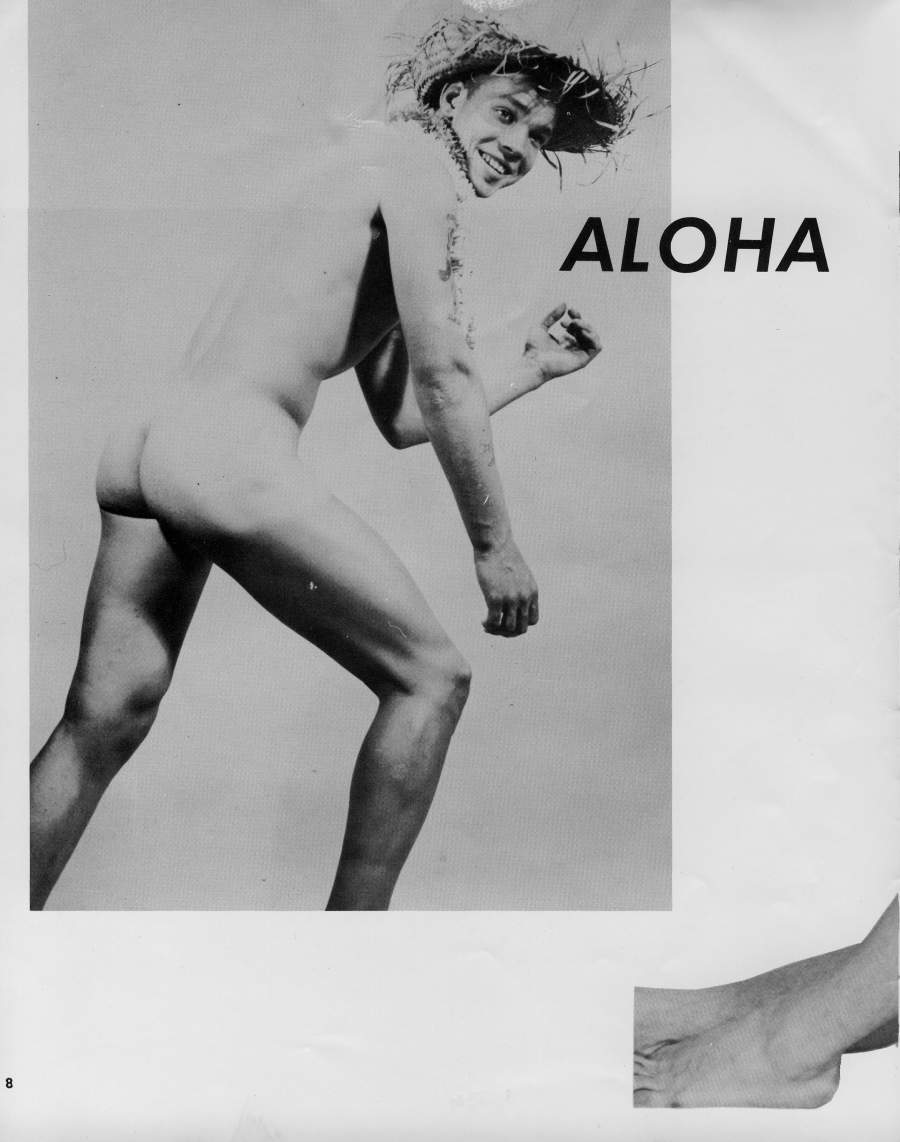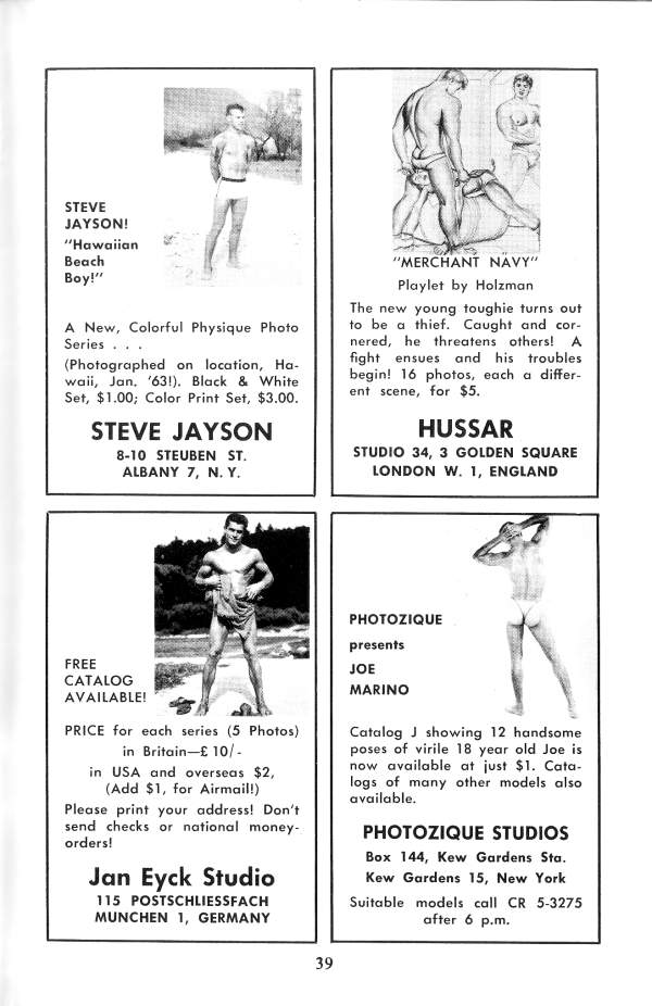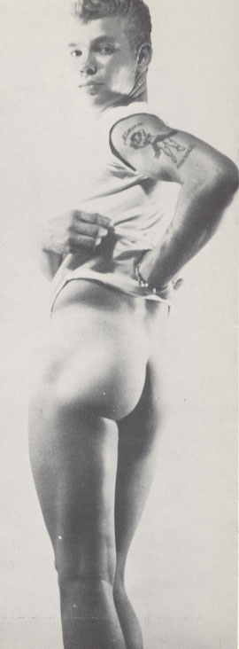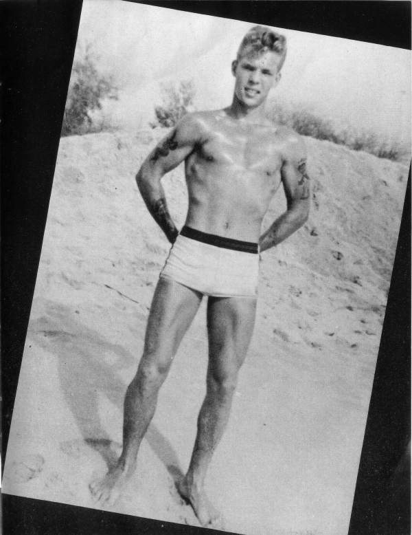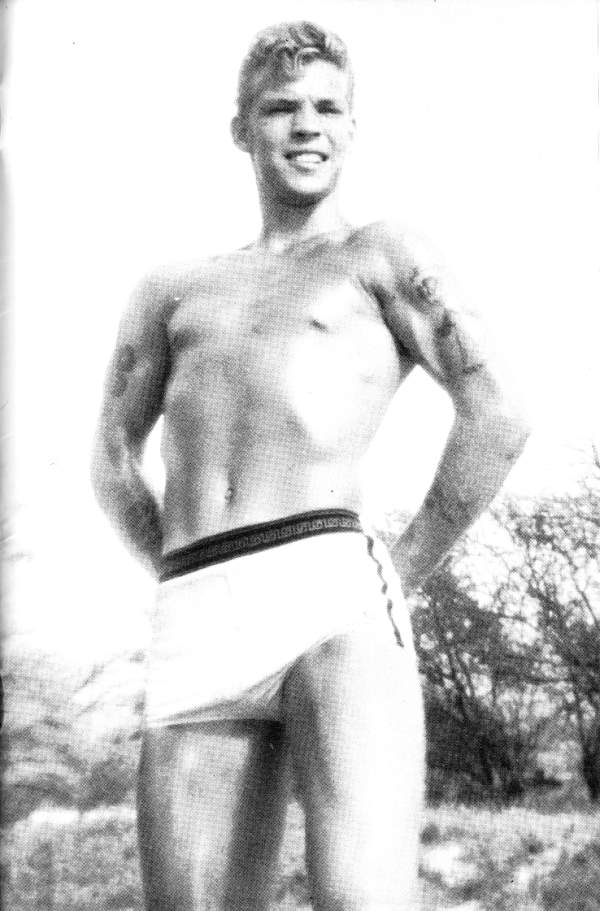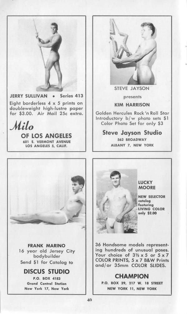 Our front coverboy is currently appearing in most every Physique Magazine you can name -and are you surprised? His inviting smile, smooth trim 6’1″ frame, with the Hawaiian maidens tripping over those biceps, all add up to one helluva great guy -and his models are tops too. We know you are all rushing orders off for his photos right now.