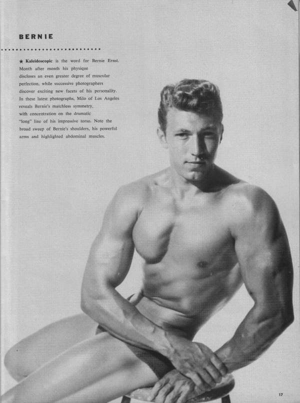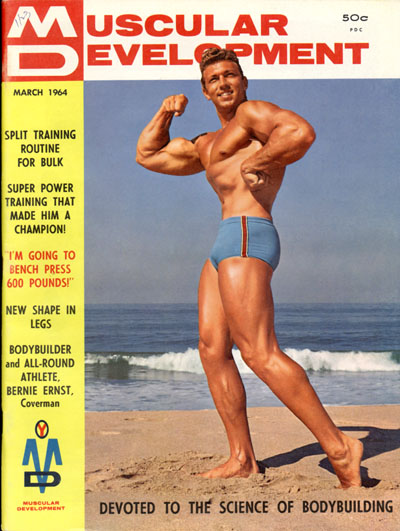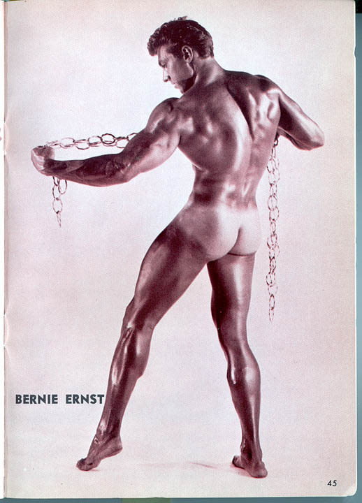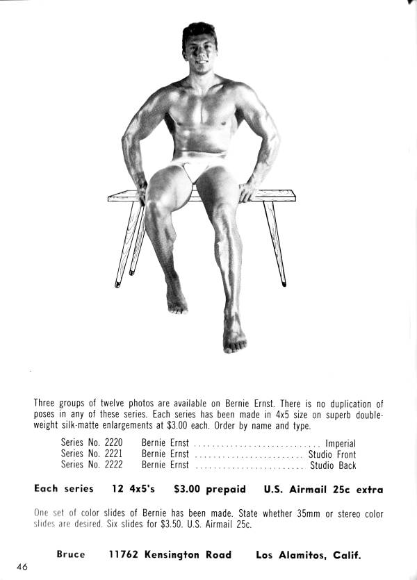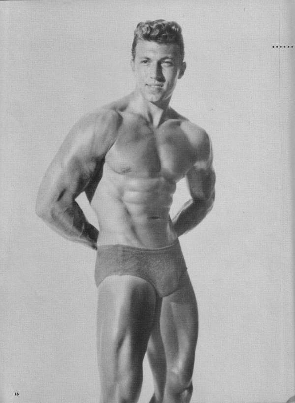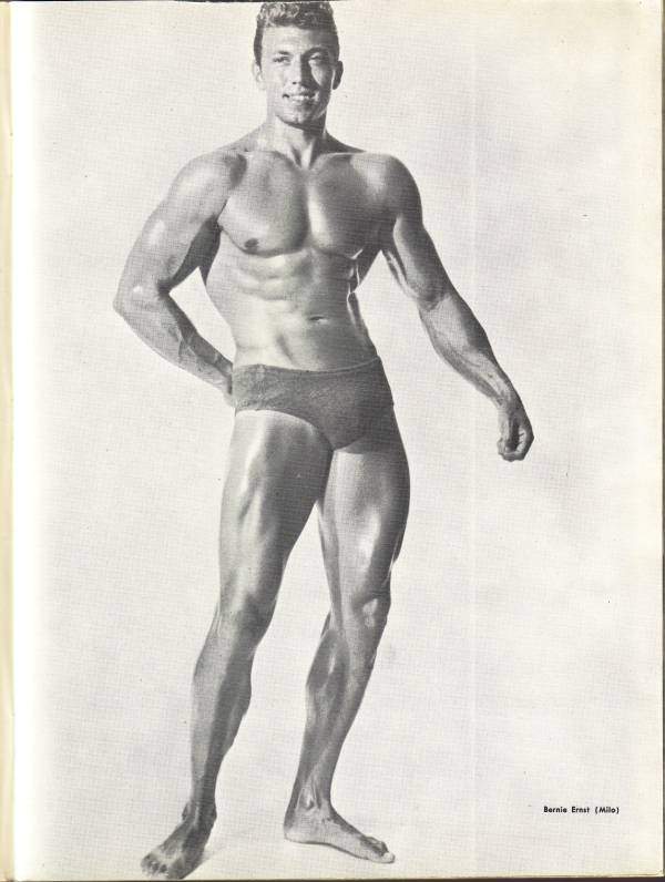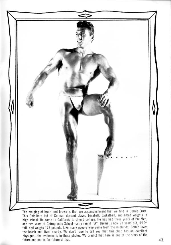 The merging of brain and brawn is the rare accomplishment that we find in Bernie Ernst. This Ohio-born lad of German descent played baseball, basketball, and lifted weights in high school. He came to California to attend college. He has had three years of Pre-Med, and two years of Chiropractic School-all straight “A”. Bernie is now 23 years old. 5’10” tall, and weighs 175 pounds. Like many people who come from the midlands. Bernie loves the beach and lives nearby. We don’t have to tell you that this chap has an excellent physique the evidence is in these photos. We predict that here is one of the stars of the future and not so far future at that.