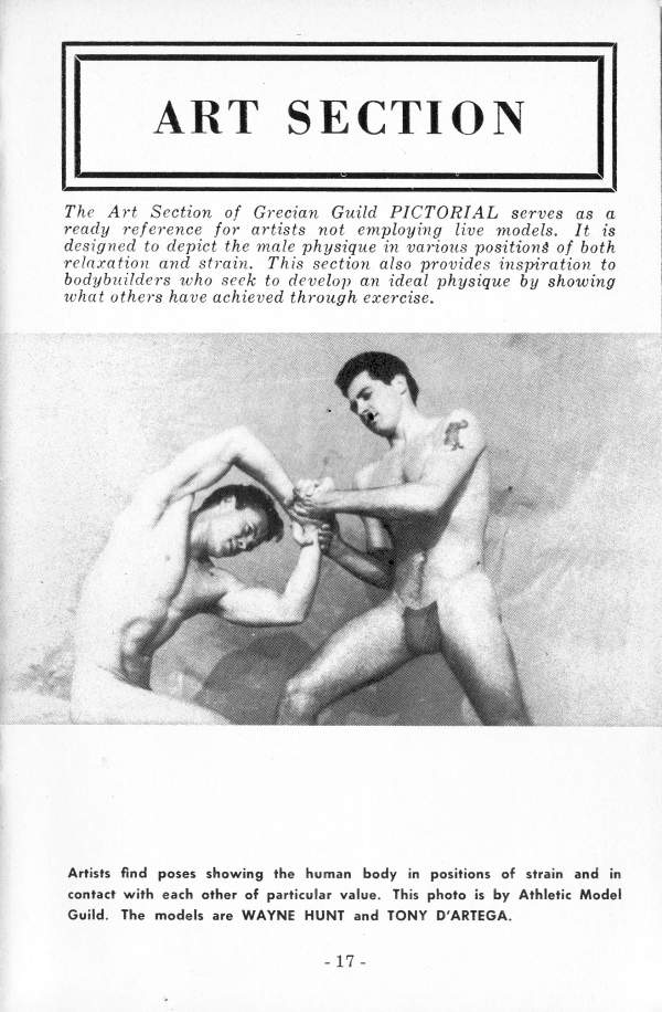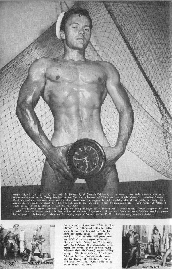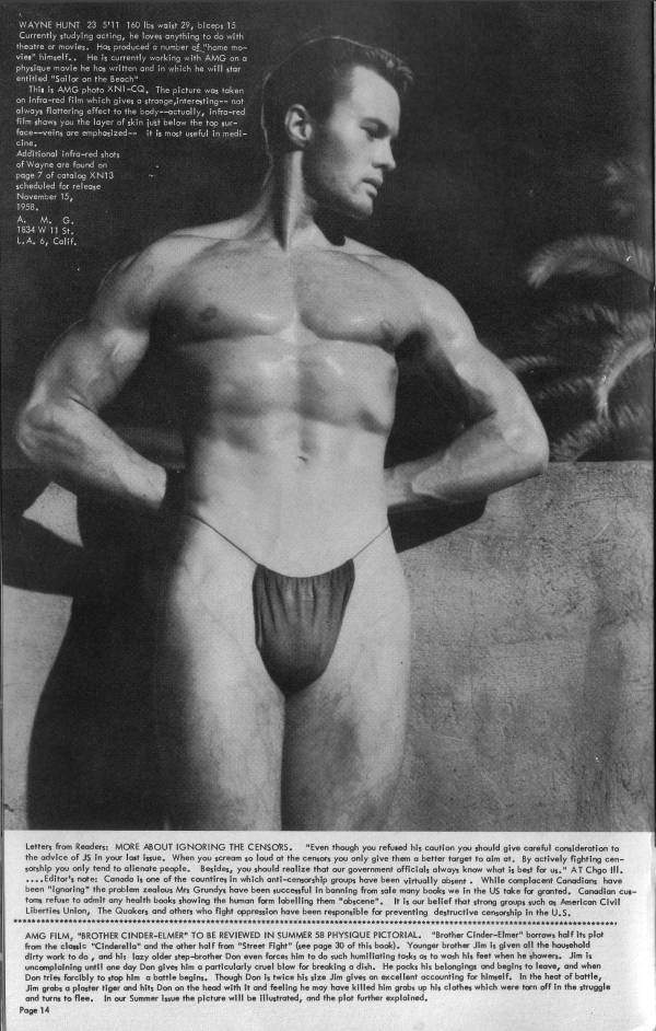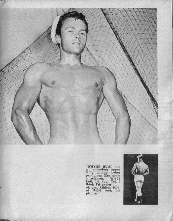 “WAYNE HUNT has a tremendous upper body without being pendulous like some musclemen. Well knit, I’d say. Yet, I think I’d prefer oh yes, Athletic Mod- el Guild took the picture.”