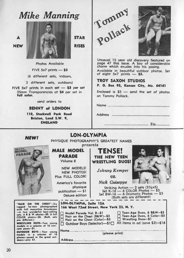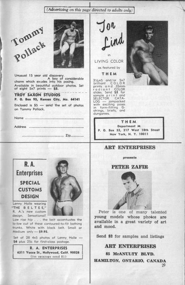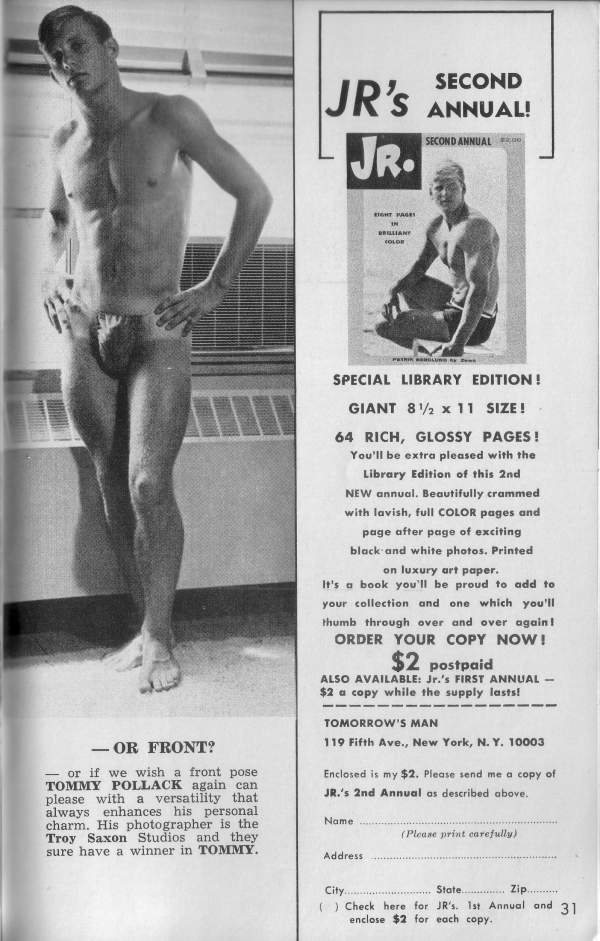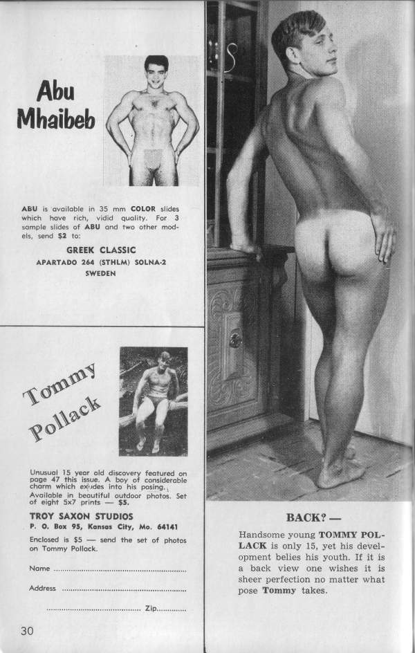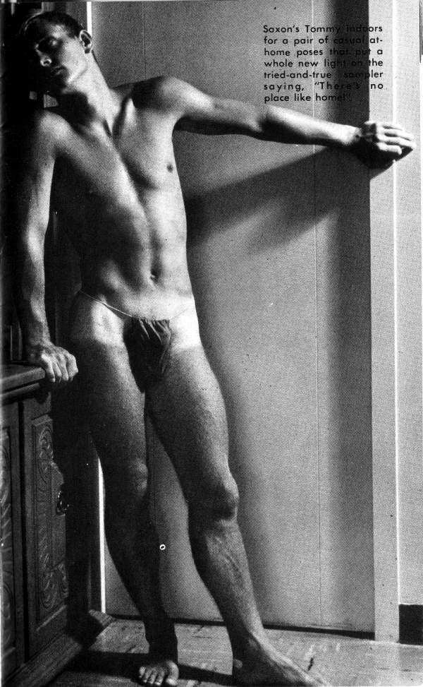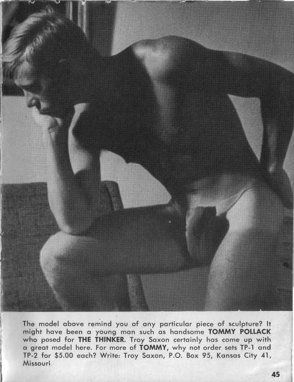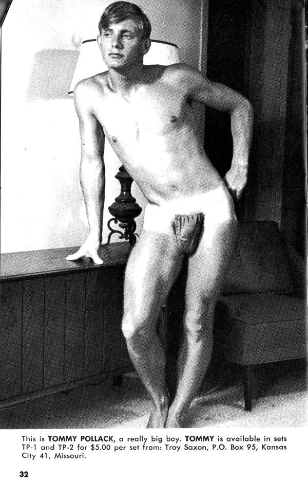 One of the most stunning models to emerge is some time from the excellent, high-class stables of Troy Saxon Studio is blond, blue- eyed, handsome Tommy Pollack. But even stacked up against the formidable competition of the Saxon Stable, the flawless male beauty of this fair haired young Adonis gets the golden apple every time. you want to see more of Tommy (and who wouldn’t!), turn the page.