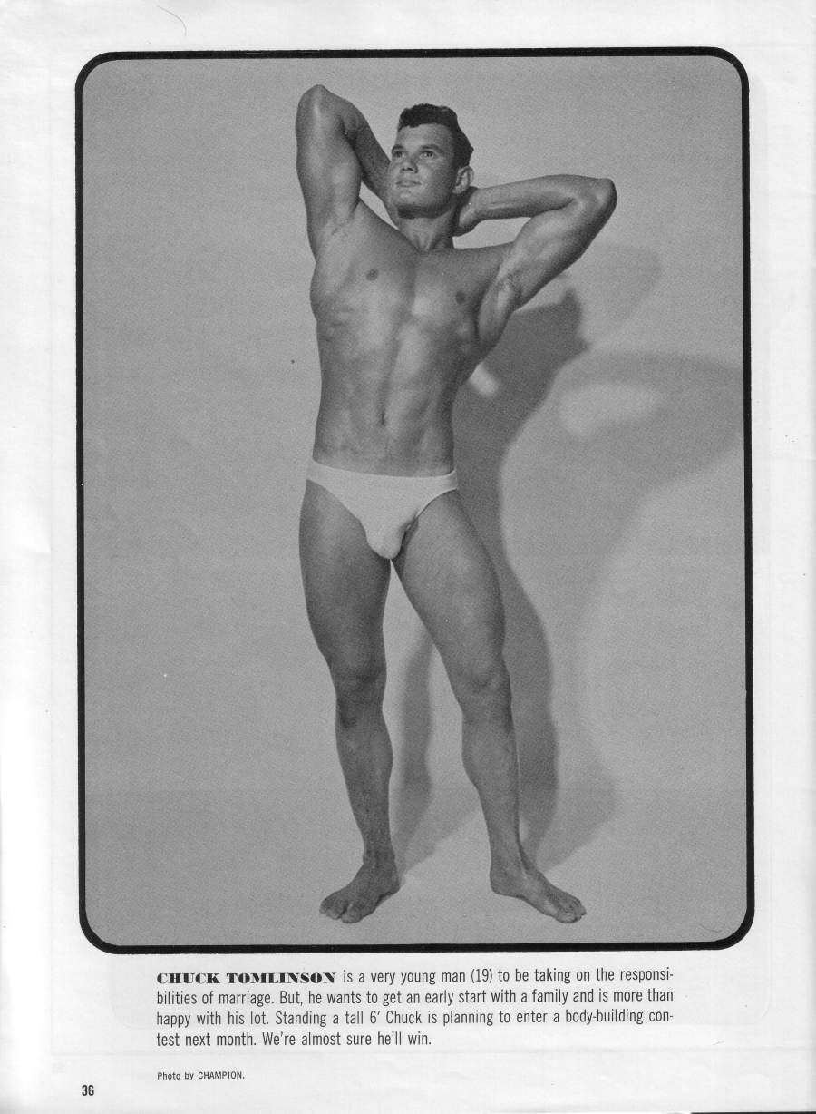 CHUCK TOMLINSON is a very young man (19) to be taking on the responsi bilities of marriage. But, he wants to get an early start with a family and is more than happy with his lot. Standing a tall 6′ Chuck is planning to enter a body-building con- test next month. We’re almost sure he’ll win.