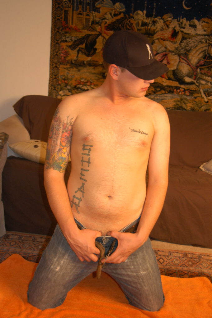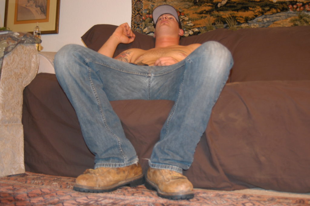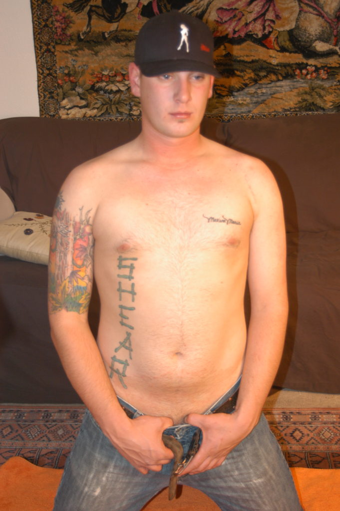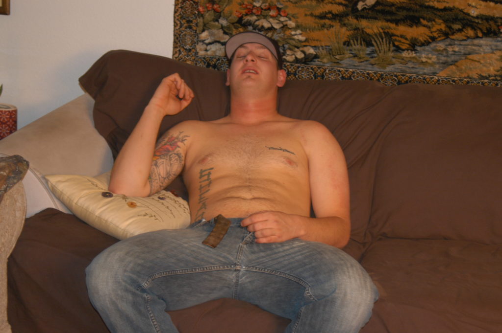 Our straight stoner-bro next door neighbor got high and posed naked for money for us in 2007. Ultimately he did a gay for pay JO film for us and went on to be fully bisexual; but here he is in all his unwashed straight construction worker glory.