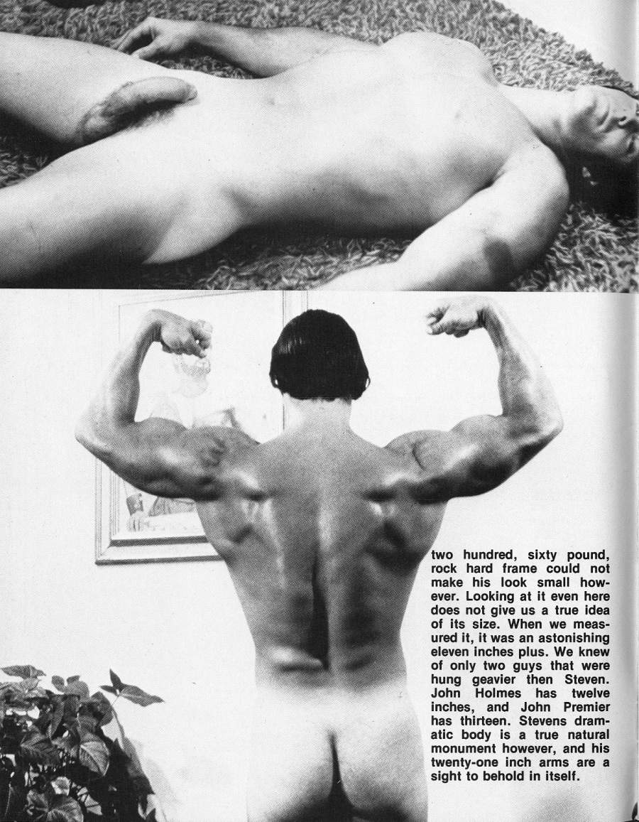 We would like to introduce Steven to you. As you can see, he is one of the biggest bodybuilders around, and he is proud of it. He carries it between his legs as well as on his arms. From the looks of things, he has alot to carry everywhere, and we doubt that anyone can meet his match. Yes, there were stars like Gorden Grant, Stacy, Cassidy, Morgan, and Dakota, but could and of them match up to this six foot seven inch tall, two hundred and sixty pound, rock hard hercules with an eleven inch hard cock, and the most rugged, handsome, masculane face that we have ever seen anywhere. Other champion bodybuilders stepped back when this guy got into the gym. When he moved on to a piece of equipment, the other body- builders moved off, and for good reason. This two hun- dred and sixty pound giant is fast as lightning, and is a California State champion heavy weight boxer.