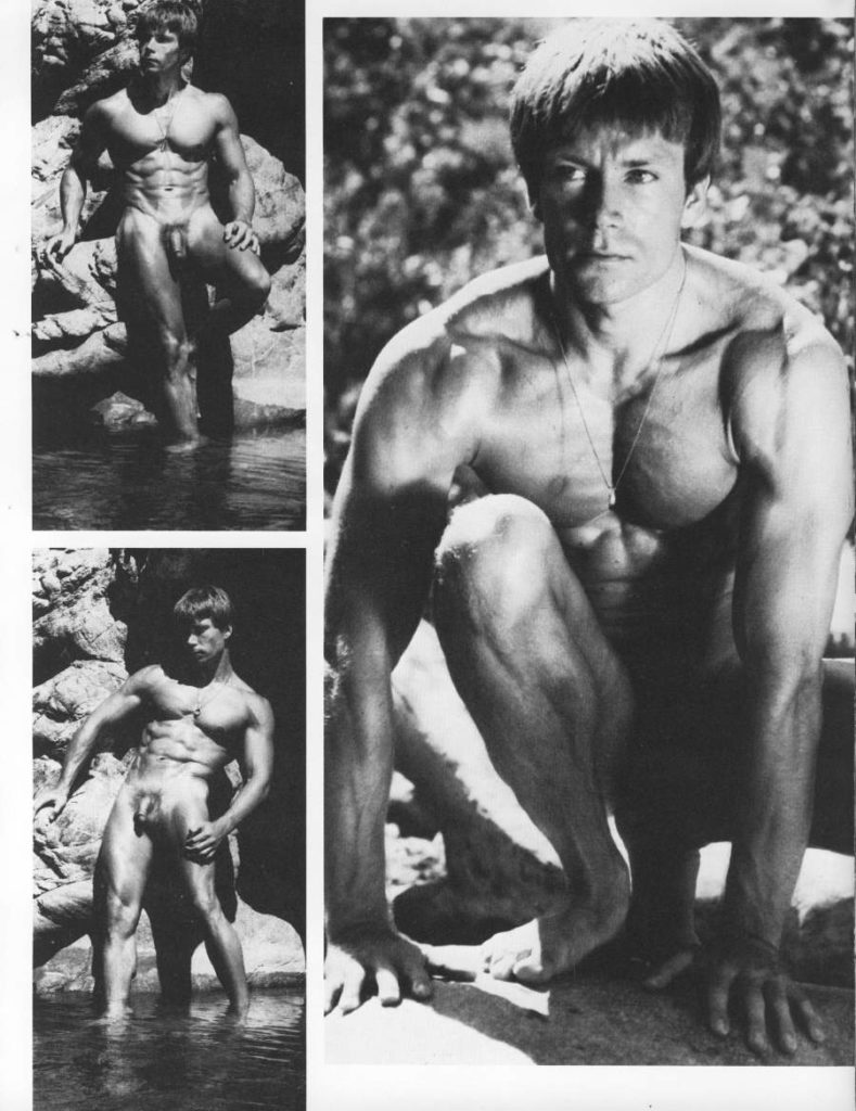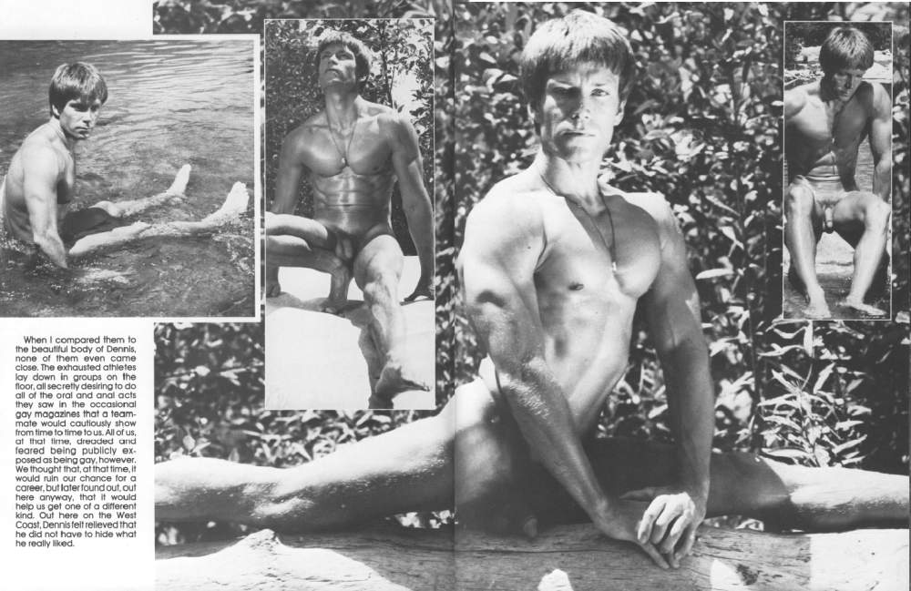 The rock-hard, chiseled body of Dennis is all the more improved with the increased amount of training he has done. The sun shines down and brings out incredible detail in his golden, tanned body. Beads of water highlight the sharpness of the muscle groups even more. We walked together down Hollywood Boulevard often. Whenever Dennis wears a tight, see- through muscle shirt on a warm summer night, cars often stop as the male occupants get a closer look. Dennis and I sometimes go to the gay bars along Hollywood Boulevard. All of the eyes are turned on to Dennis as he walks in. Several of the patrons come up and ask him if he would like to model for them. Sooner or later, to my disappointment, Dennis leaves with one of them. It’s not hard to see why a guy, with looks and a body like that, suddenly becomes the most popular guy in town.
