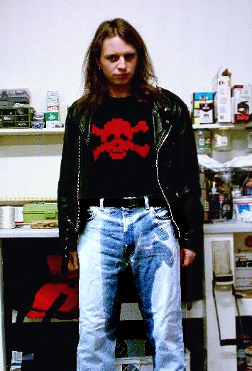 Pissing my pants in my punk skull T-shirt in the garage January 2003