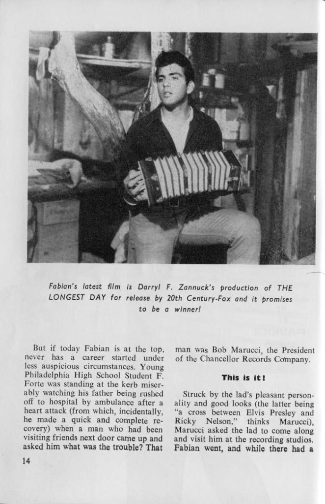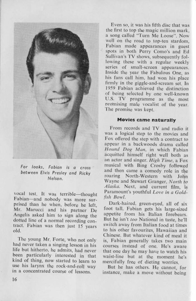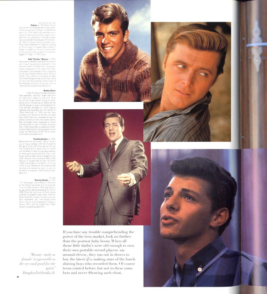 Though Fabian was widely regarded as a manufactured star in the late 50s and early 60s, he was widely idolized by both men and women through marketing in the physique magazines to men and teen idol rags to women.