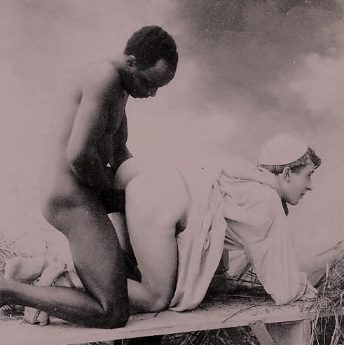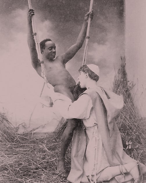 A young catholic monk rides an actual enslaved person’s dick while he’s restrained to the bench with metal shackles in these historical photos from the 1850s.