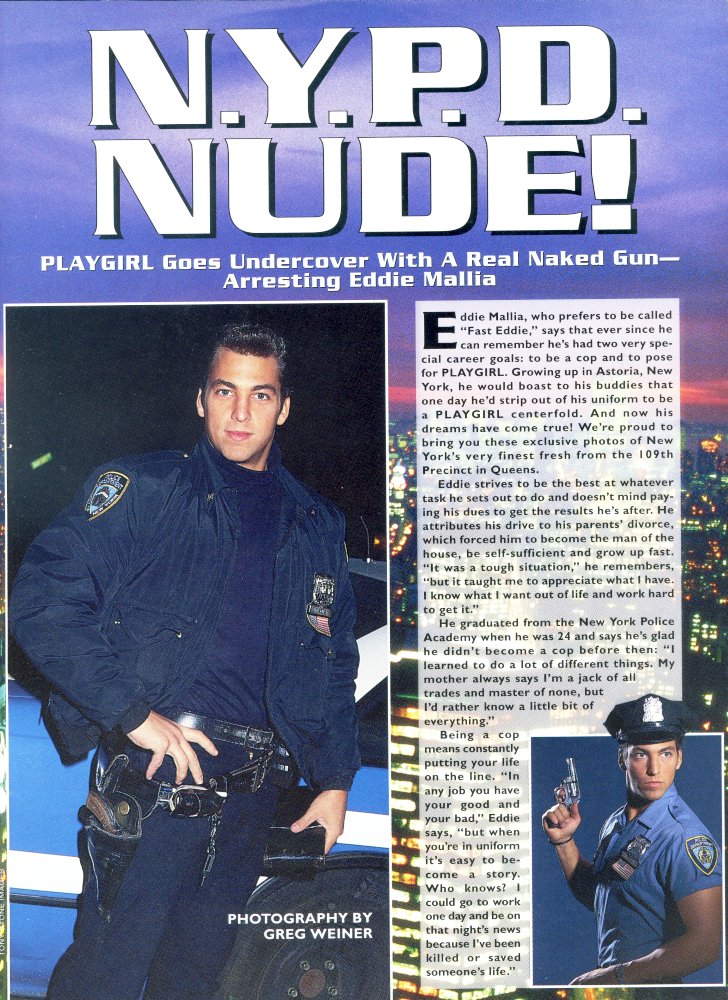 ddie Mallia, who prefers to be called E “Fast Eddie,” says that ever since he can remember he’s had two very spe cial career goals: to be a cop and to pose for PLAYGIRL. Growing up in Astoria, New York, he would boast to his buddies that one day he’d strip out of his uniform to be a PLAYGIRL centerfold. And now his dreams have come true! We’re proud to bring you these exclusive photos of New York’s very finest fresh from the 109th Precinct in Queens.