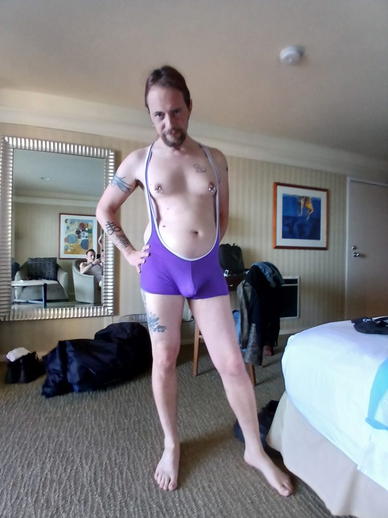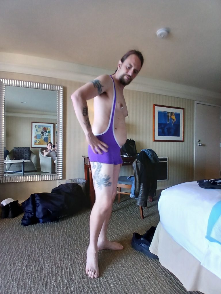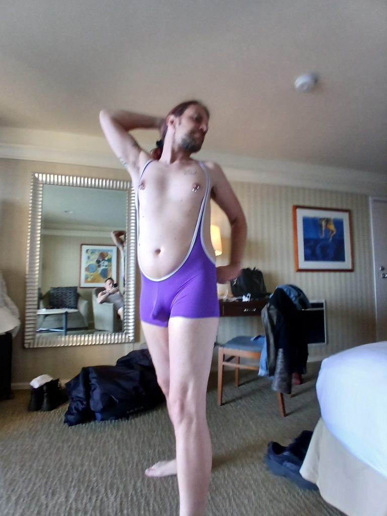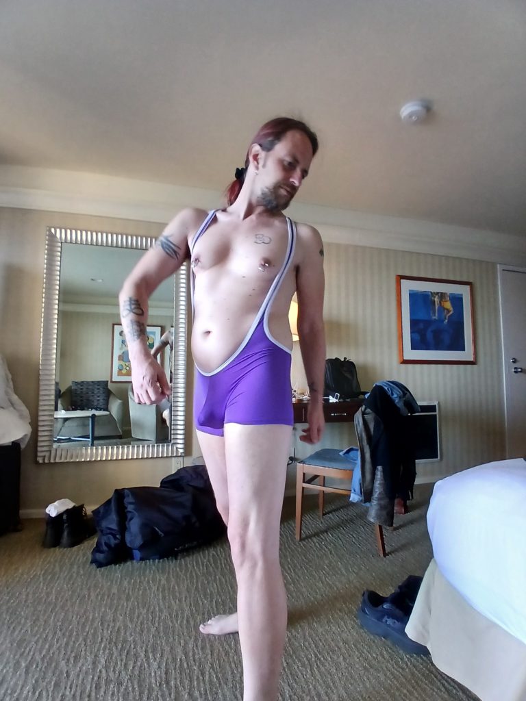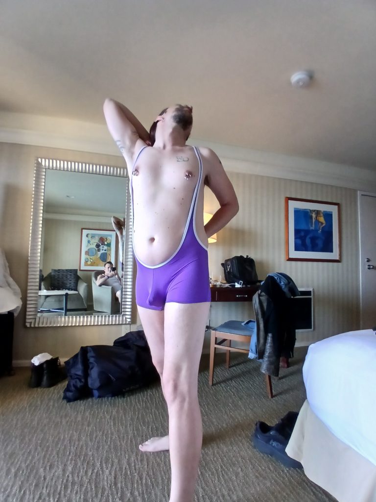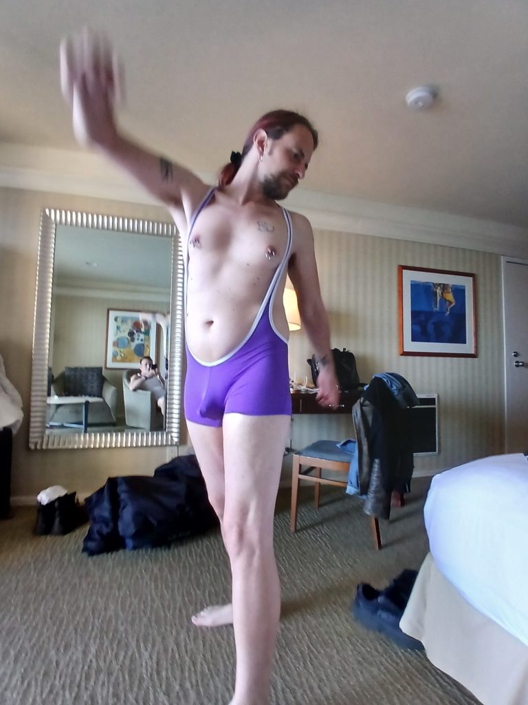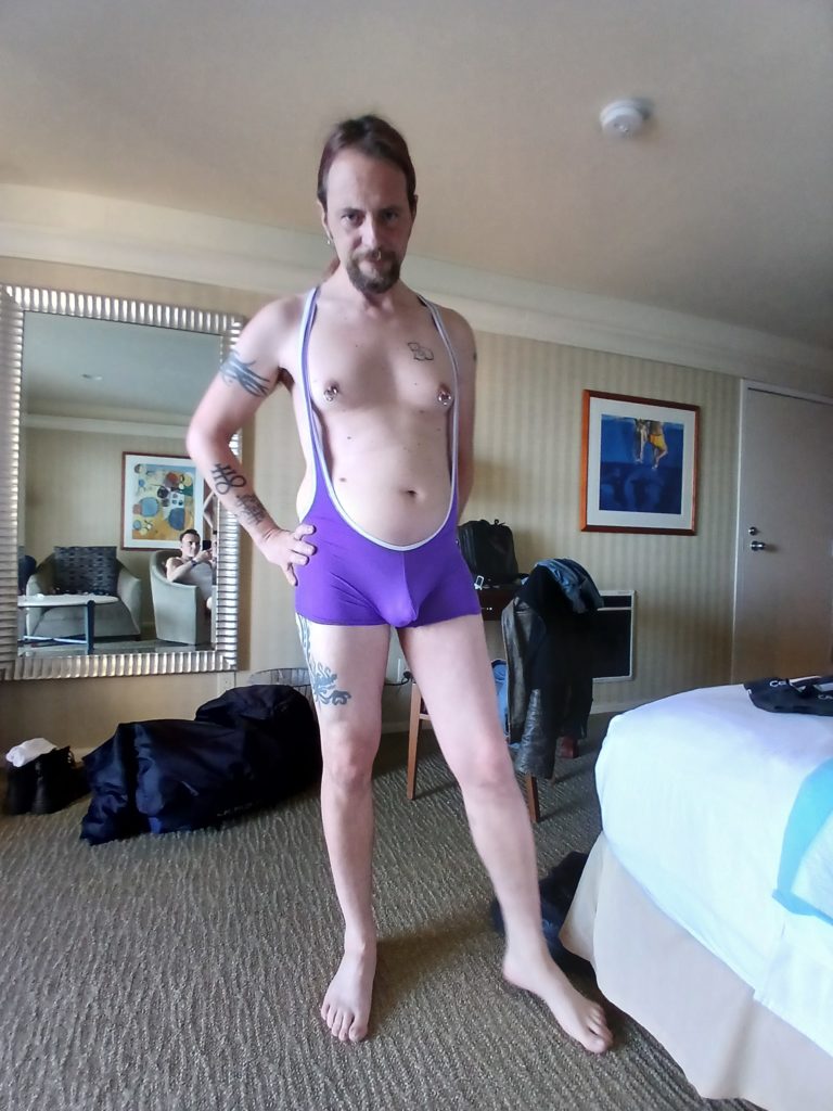 Looking like a work of art in the mirror, I asked my friend to photograph me stripping out of my witchy pink and black harem pants to reveal the purple sex singlet beneath.
