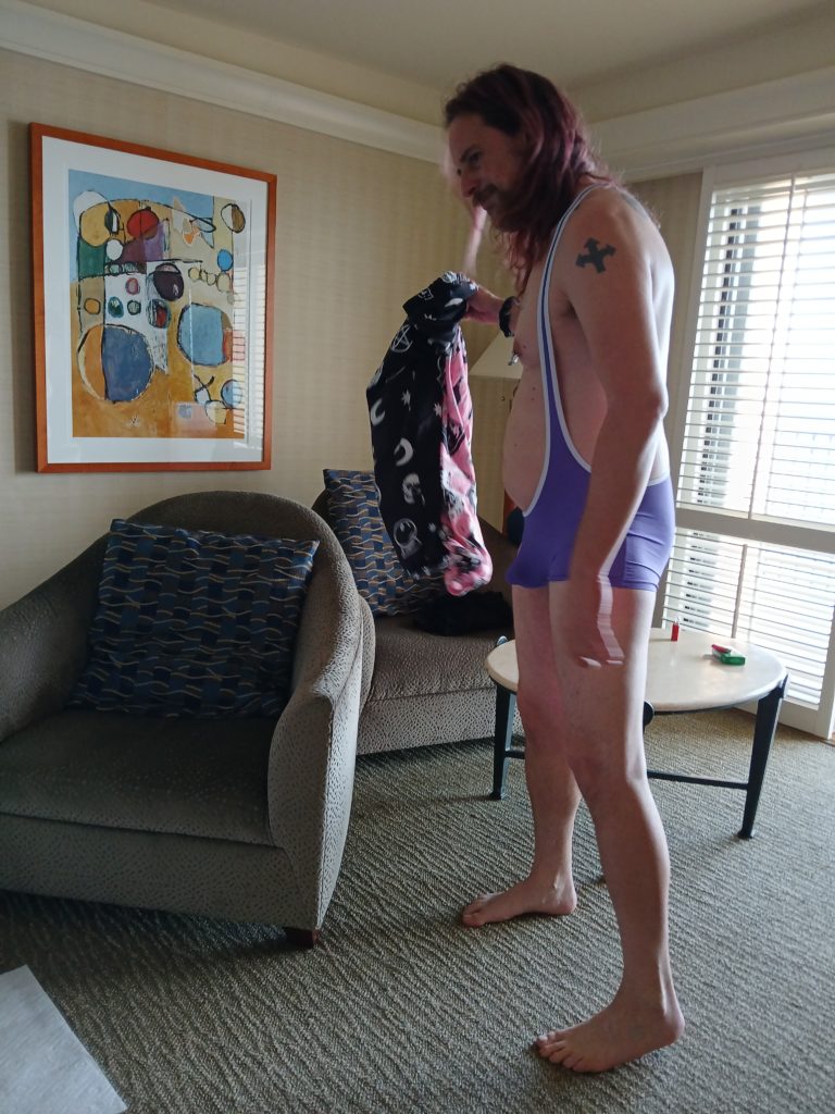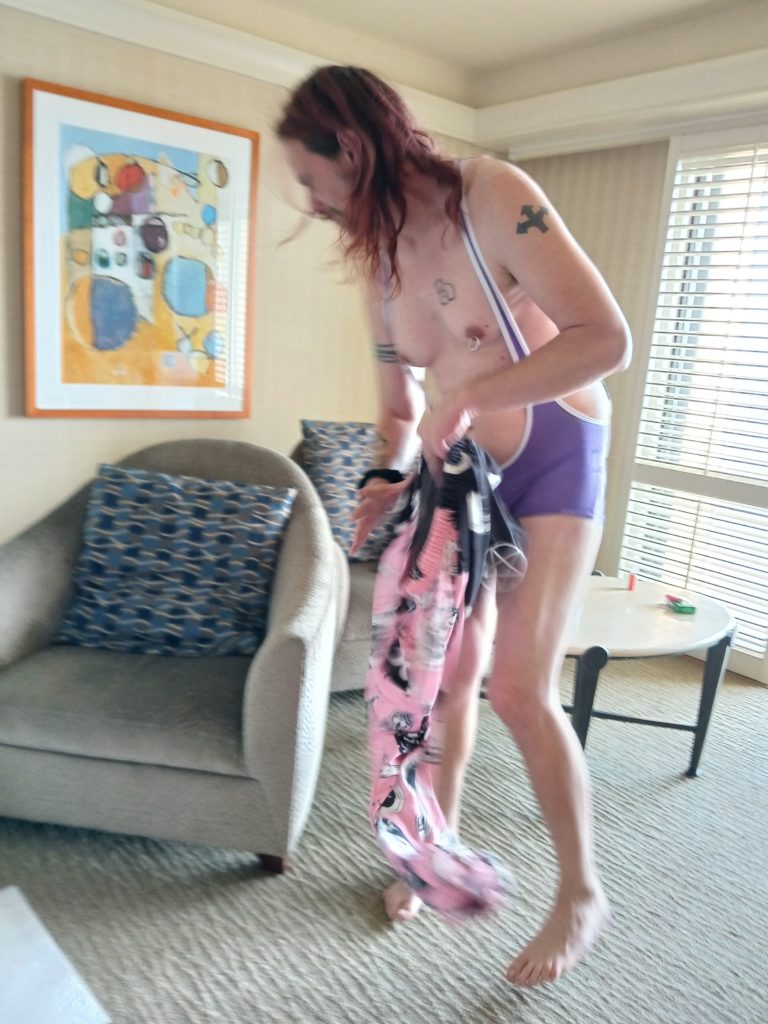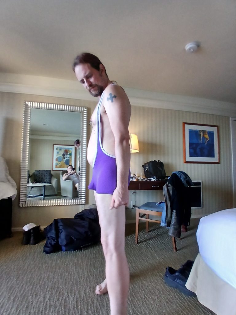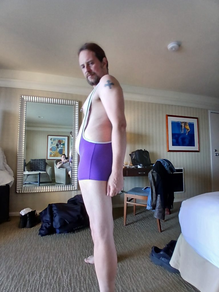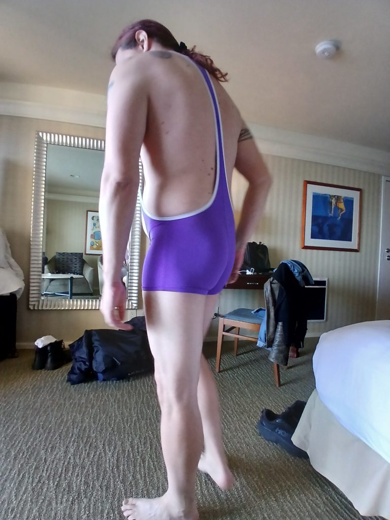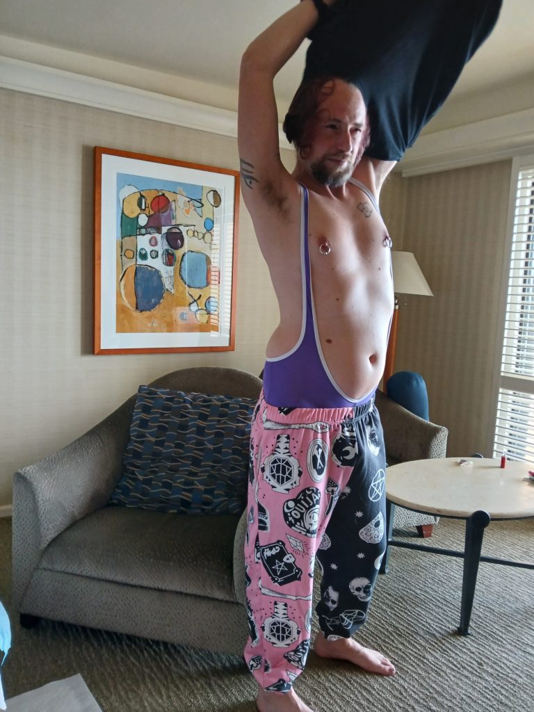 Looking like a work of art in the mirror, I asked my friend to photograph me stripping out of my witchy pink and black harem pants to reveal the purple sex singlet beneath.