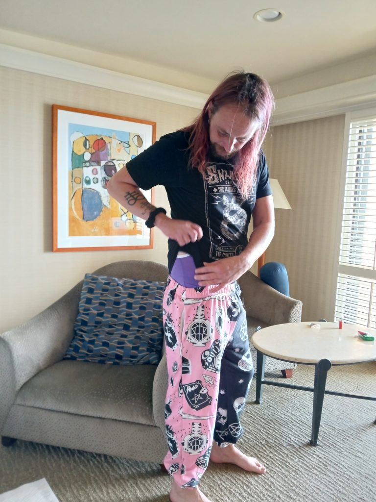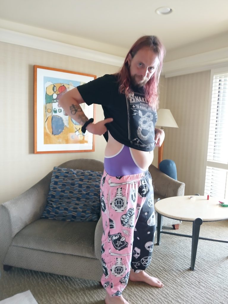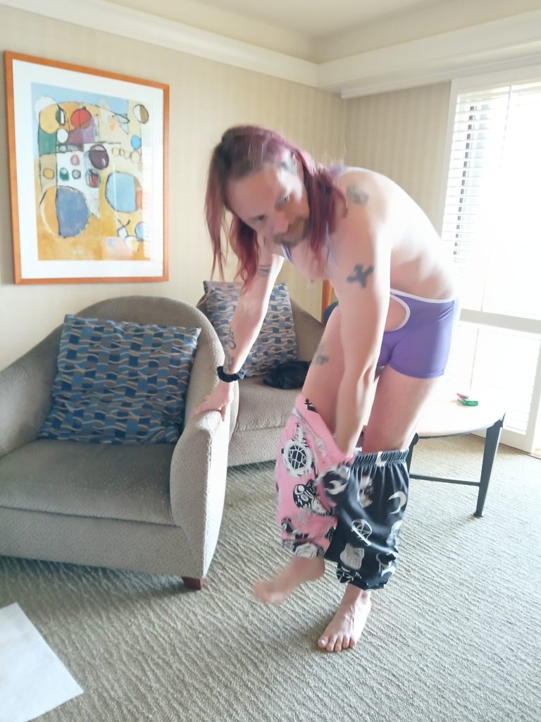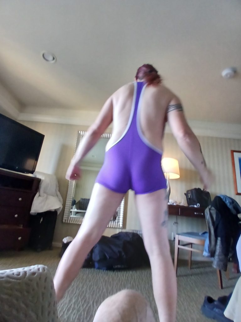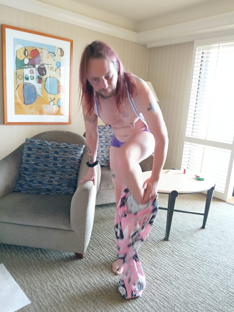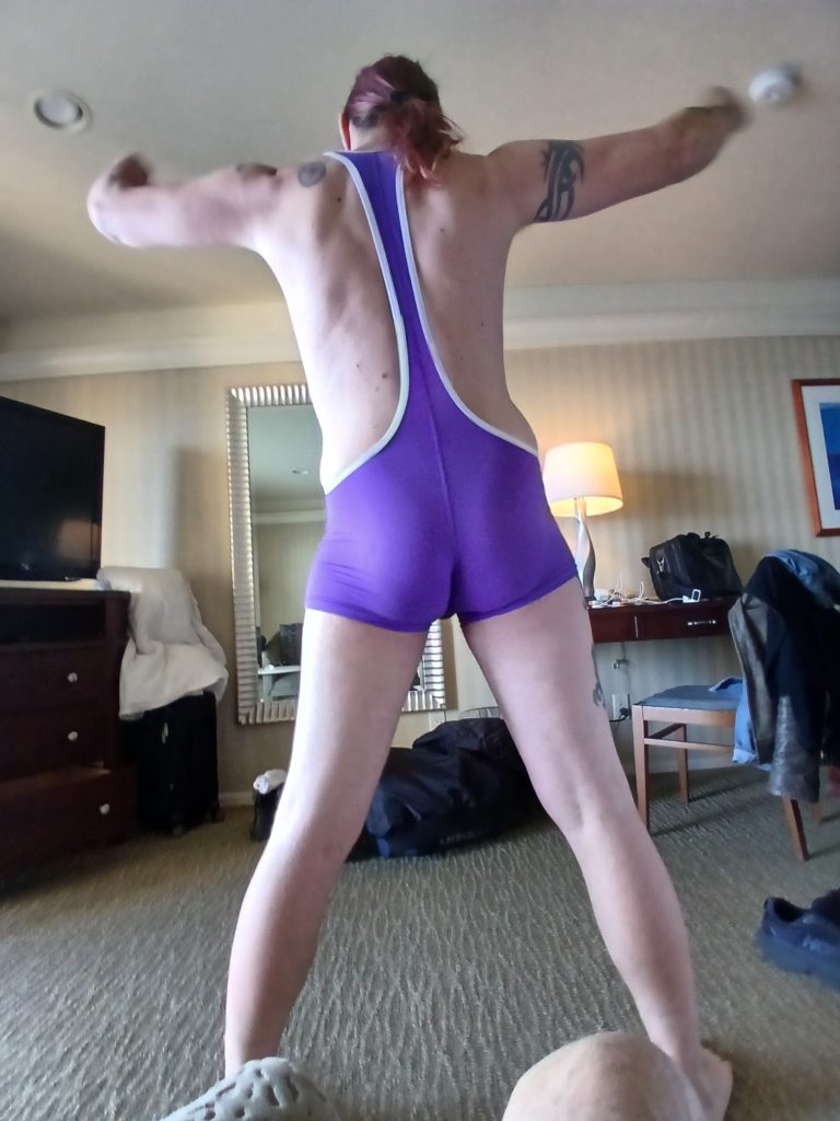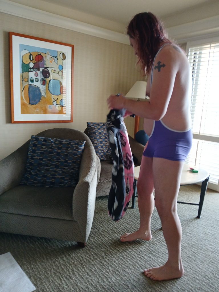 Looking like a work of art in the mirror, I asked my friend to photograph me stripping out of my witchy pink and black harem pants to reveal the purple sex singlet beneath.