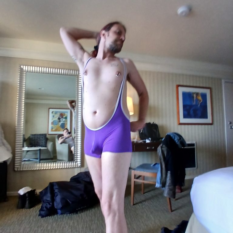 Looking like a work of art, I asked my friend from the mirror universe to photograph me stripping out of my witchy harem pants to reveal the purple sex singlet beneath.