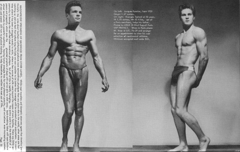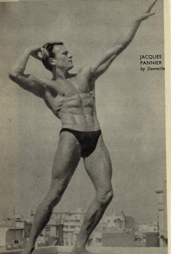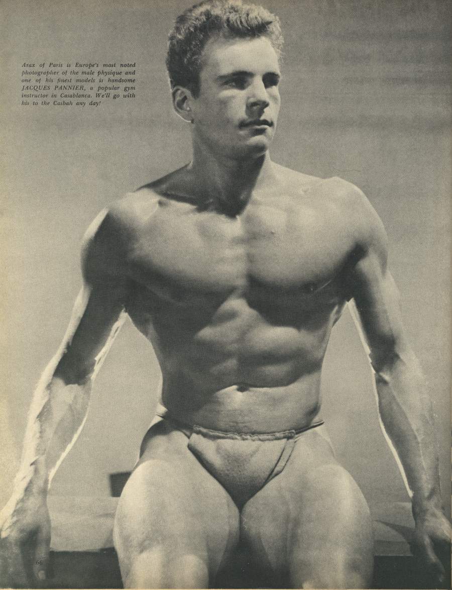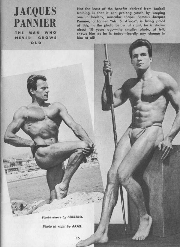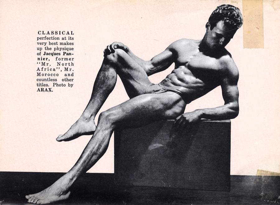 Nightclub singer and bodybuilder Jacques Pannier, Mr. North Africa 1950 (and a descendant of Jacques Étienne Pannier, the famous French historian) started in the 40s and was still going strong by the early 60s. He posed for a number of photographers including Arax, Fererro, and Jon Paginton.