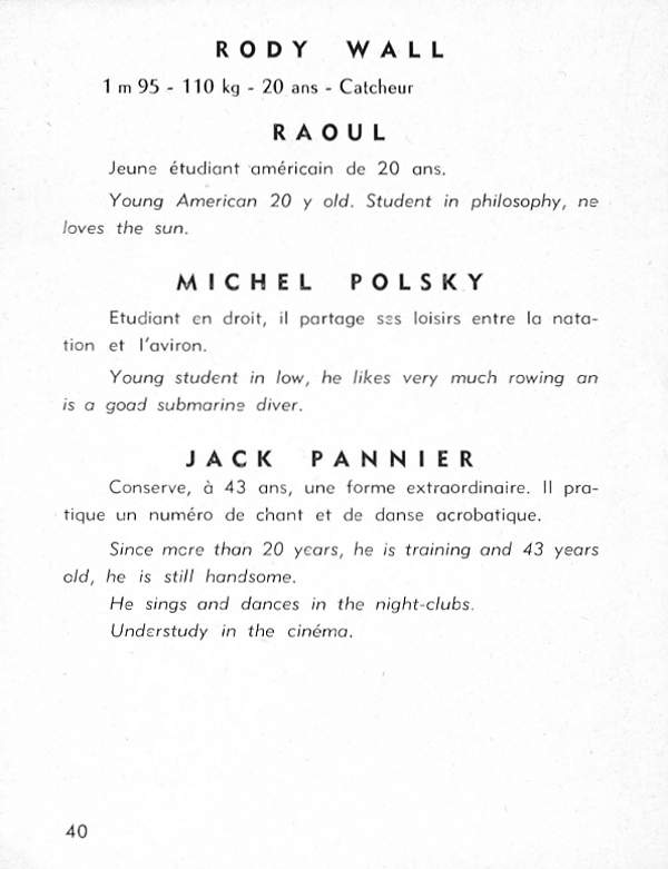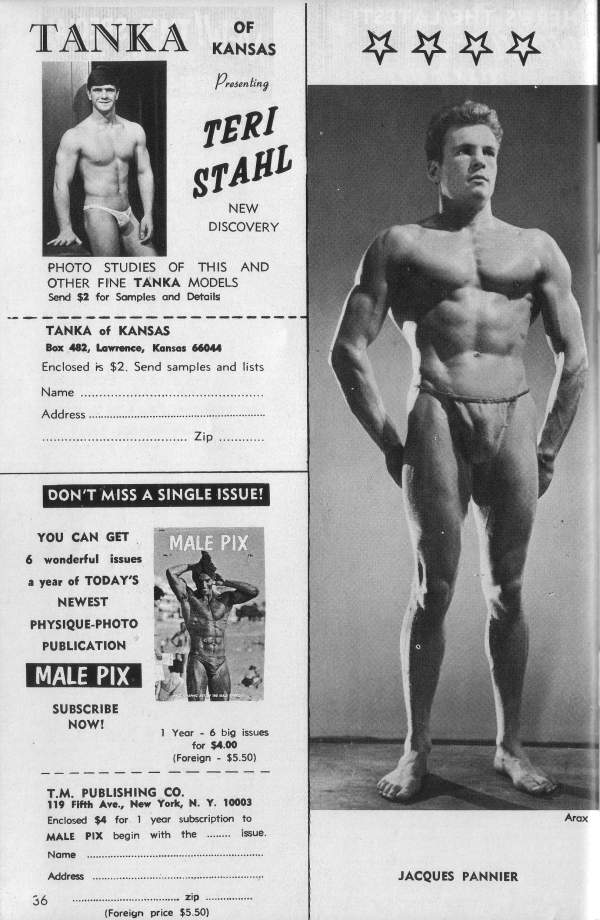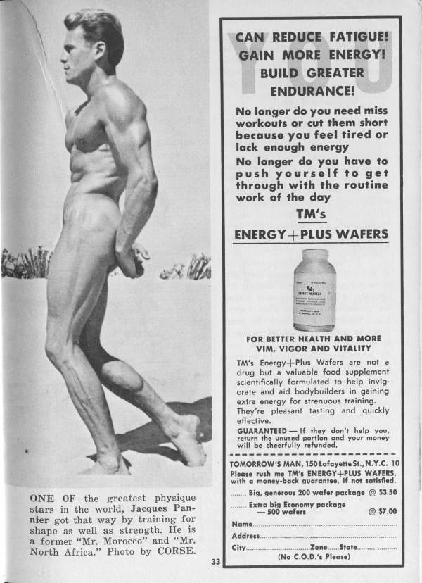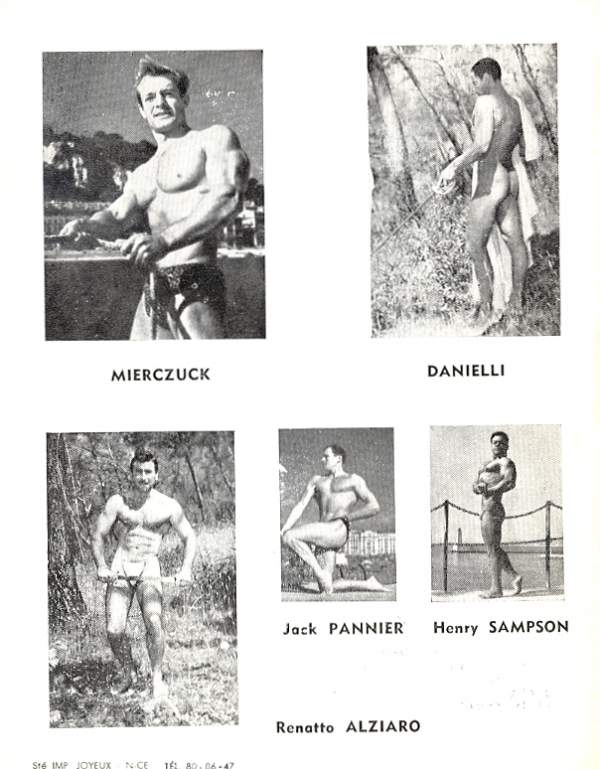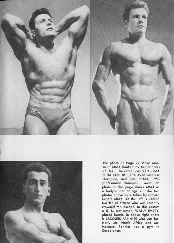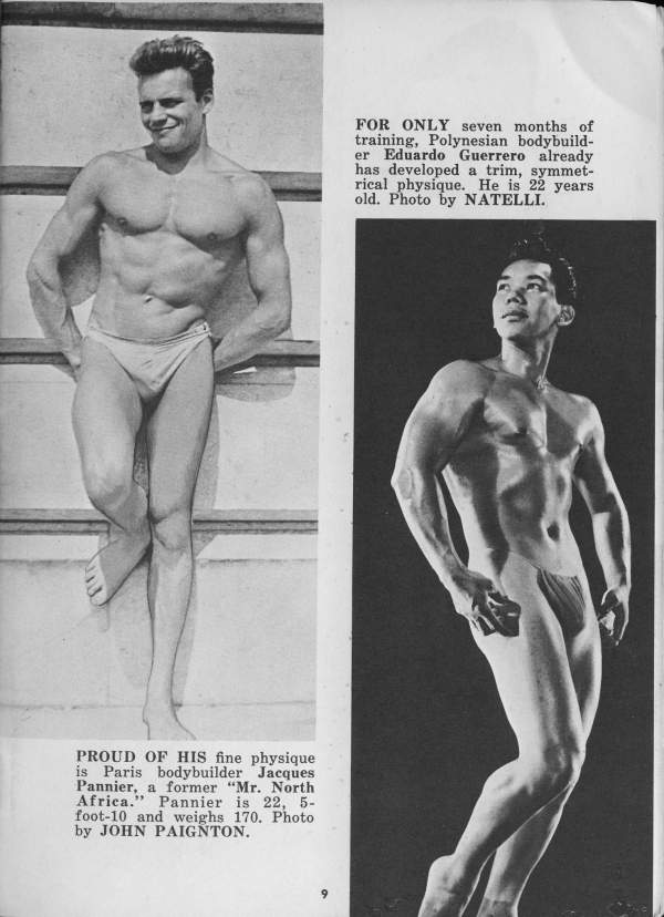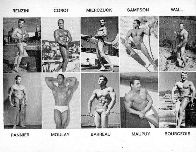 Nightclub singer and bodybuilder Jacques Pannier, Mr. North Africa 1950 (and a descendant of Jacques Étienne Pannier, the famous French historian) started in the 40s and was still going strong by the early 60s. He posed for a number of photographers including Arax, Fererro, and Jon Paginton.