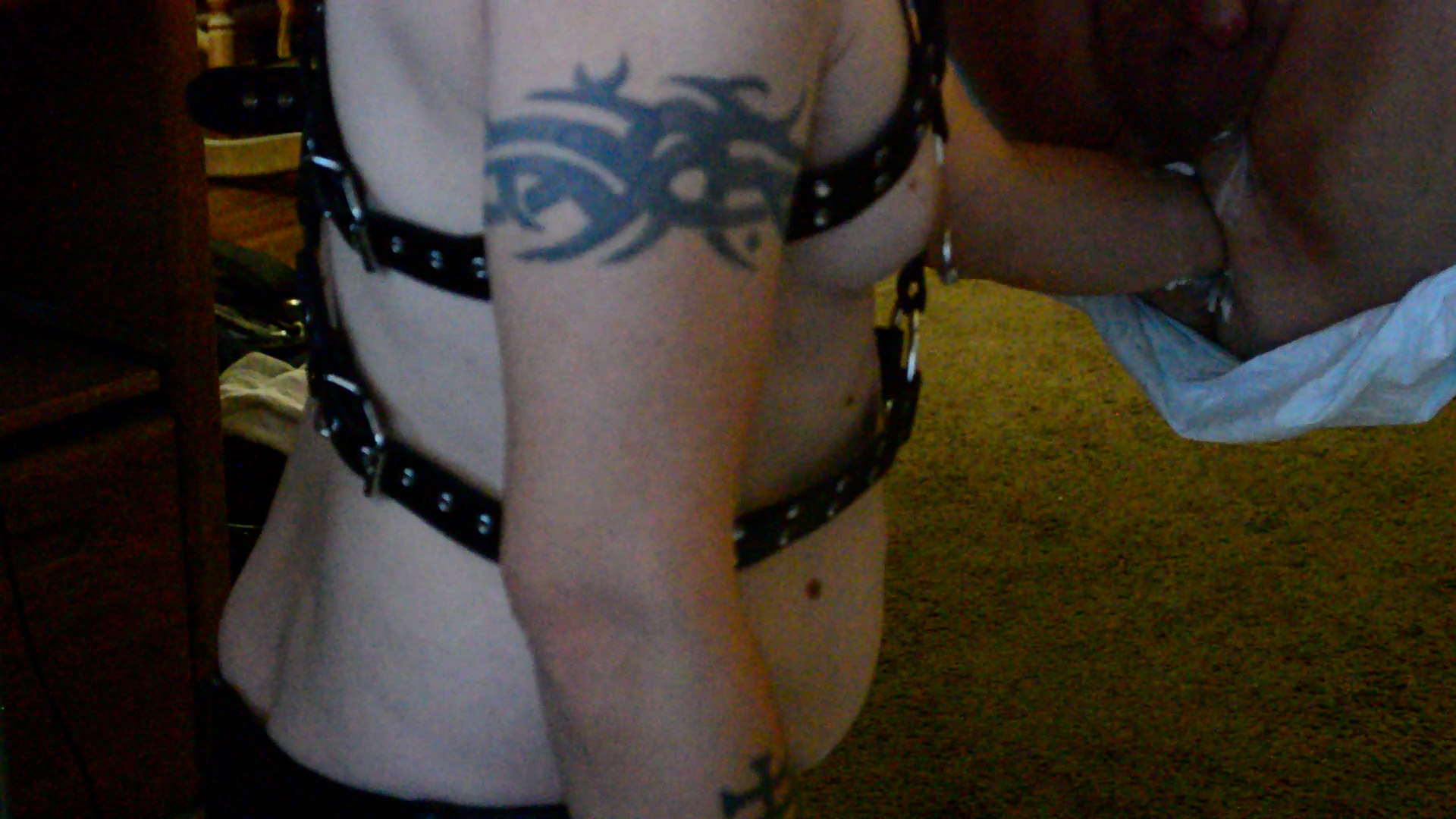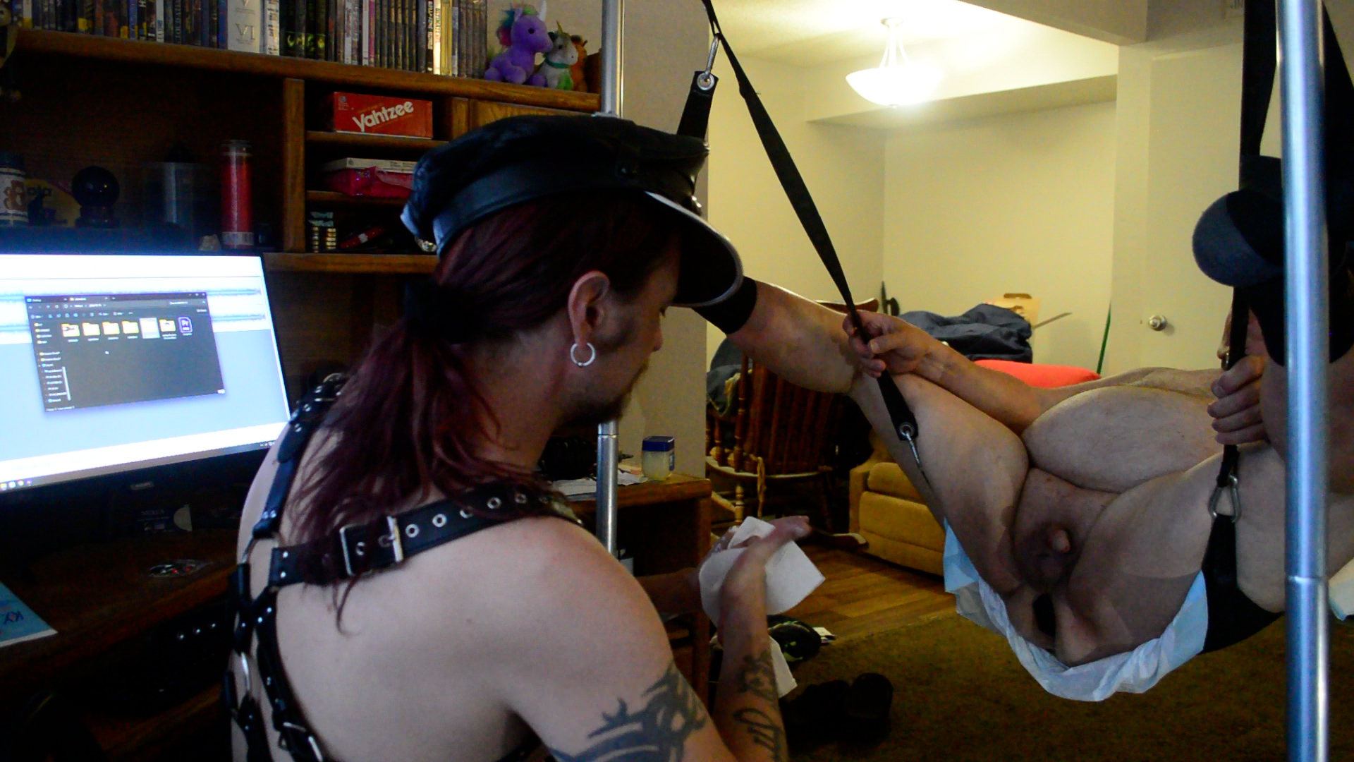 I’d been careful not to wreck the tightness of Slave JJ’s hole up until then, but the last night we did heavy toy play with Rubber Pig’s huge fisting toys after tying him down in the sling.