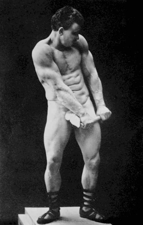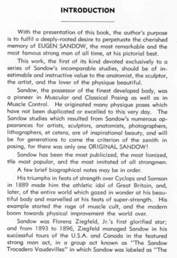 Sandow, the possessor of the finest developed body, was a pioneer in Muscular and Classical Posing as well as in Muscle Control. He originated many physique poses which have not been duplicated or excelled to this very day. The Sandow studies which resulted from Sandow’s numerous op- pearances for artists, sculptors, anatomists, photographers, lithographers, et cetero, are of inspirational beauty, and will be for generations to come the criterion of the zenith in posing, for there was only one ORIGINAL SANDOW!