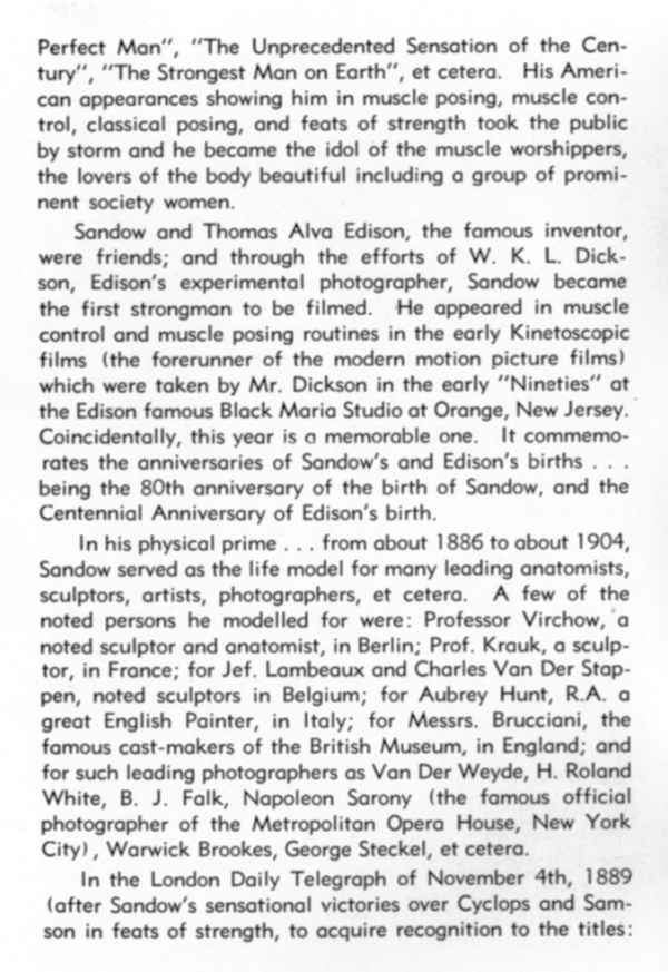 Sandow and Thomas Alva Edison, the famous inventor, were friends; and through the efforts of W. K. L. Dick- son, Edison’s experimental photographer, Sandow became the first strongman to be filmed. He appeared in muscle control and muscle posing routines in the early Kinetoscopic films (the forerunner of the modern motion picture films) which were taken by Mr. Dickson in the early “Nineties” at the Edison famous Black Maria Studio at Orange, New Jersey. Coincidentally, this year is a memorable one. It commemo- rates the anniversaries of Sandow’s and Edison’s births… being the 80th anniversary of the birth of Sandow, and the Centennial Anniversary of Edison’s birth.
