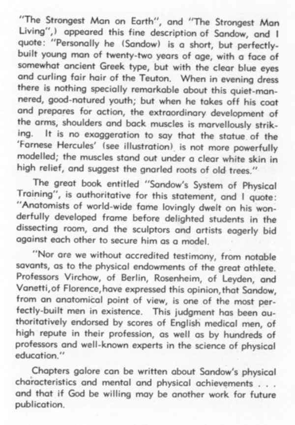 “Nor are we without accredited testimony, from notable savants, as to the physical endowments of the great athlete. Professors Virchow, of Berlin, Rosenheim, of Leyden, and Vanetti, of Florence, have expressed this opinion, that Sandow, from an anatomical point of view, is one of the most per- fectly-built men in existence. This judgment has been au- thoritatively endorsed by scores of English medical men, of high repute in their profession, as well as by hundreds of professors and well-known experts in the science of physical education.”