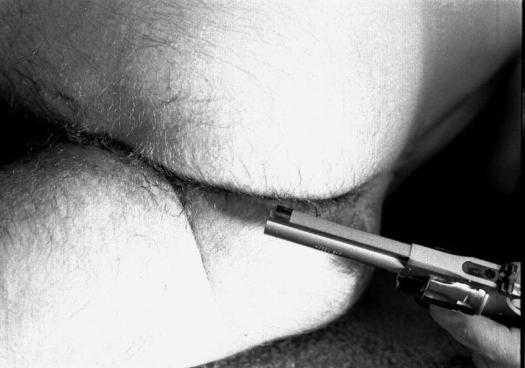 Classic Prints photographs model Will in handcuffs with a gun up his ass.
