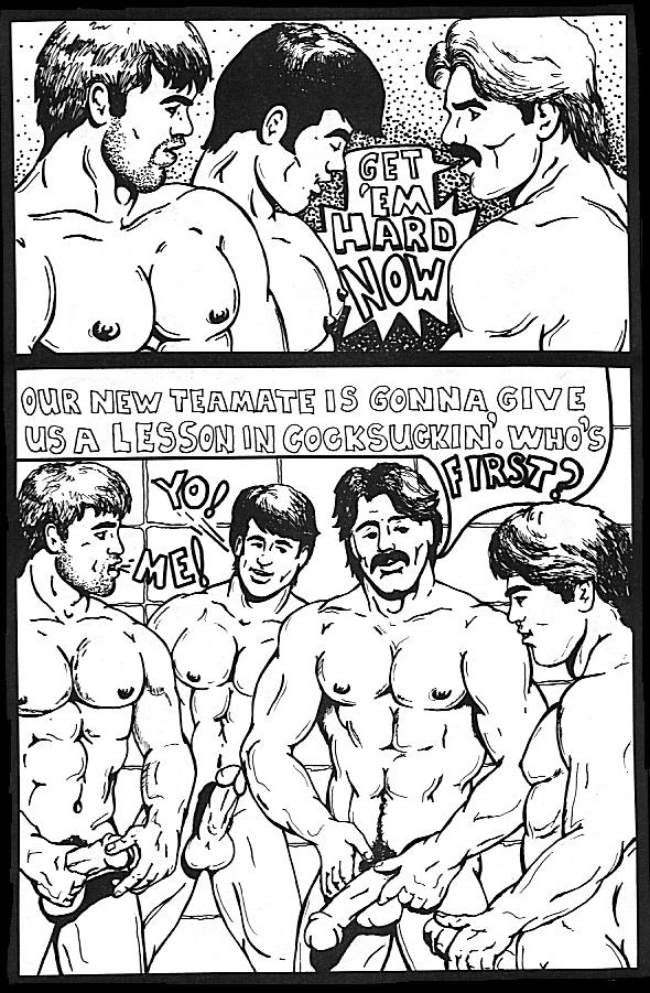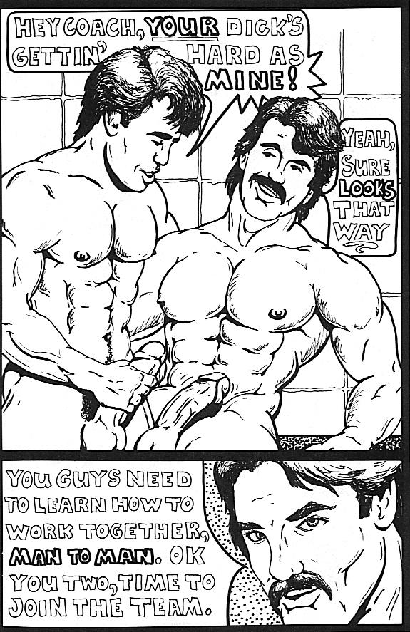 Coach catches the jocks in the locker room having a cock fight and teaches them that Team Players Goon Together.