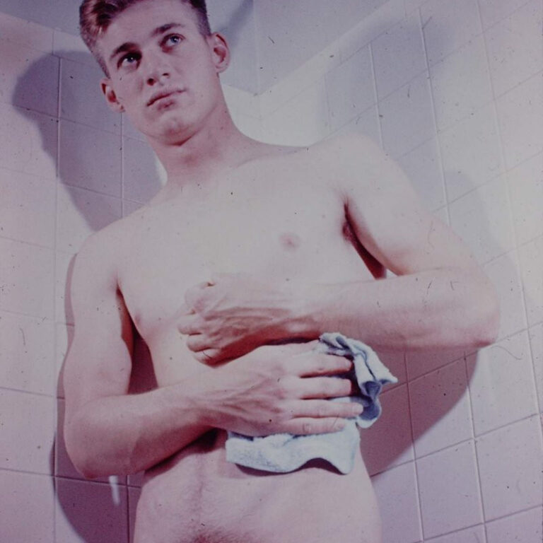 Black and white boys posing for AMG in Bob Mizer’s shower in the early 60s.