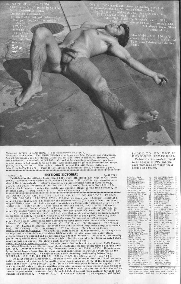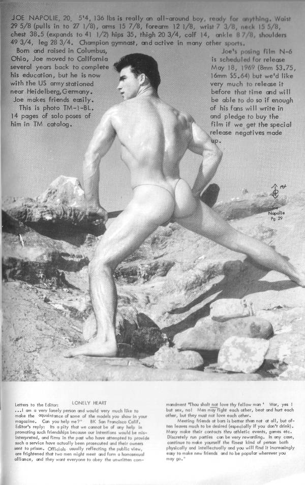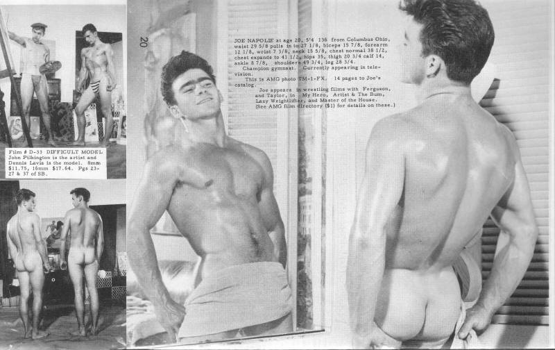 JOE NAPOLIE at age 20, 514 136 from Columbus Ohio, waist 29 5/8 pulls in t27 1/8, biceps 15 7/8, forearm 12 1/8, waist 7 3/6, neck 15 5/8, chest normal 38 1/2, cheat expands to 41 1/2, hips 35, thigh 20 3/4 calf 14, ankle 7/5, shoulders 49 3/4, log 28 3/4. Champion gymnast. Currently appearing in tele-vision. This is AMG photo TM-1-FX, 14 pages to Jon’s catalog. Jus appears, wrestling films with Ferguson, and Taylor, in My Hero, Artist & The Bum, Lazy Weightlifter , and Master of the House. See AMG film directory (51) for details on these.)