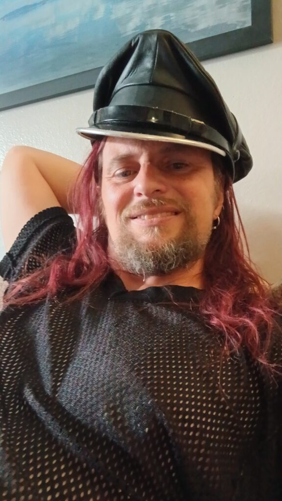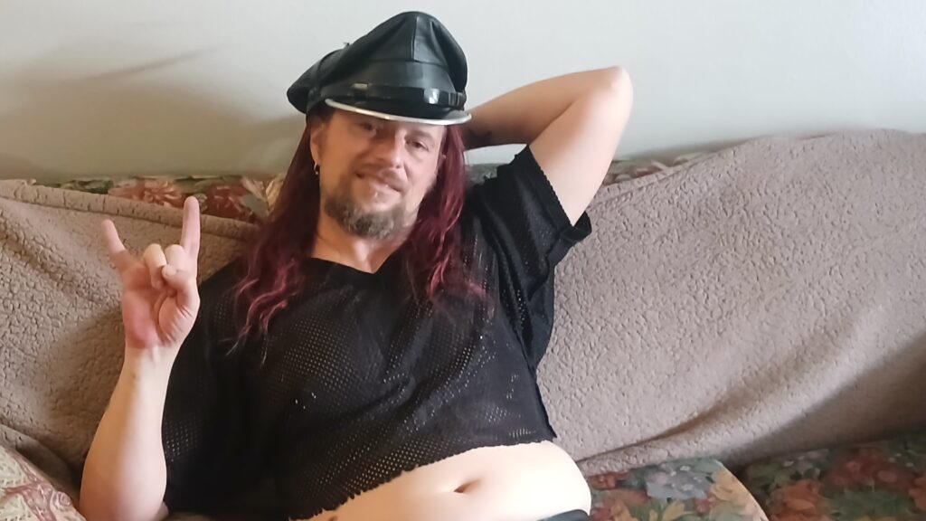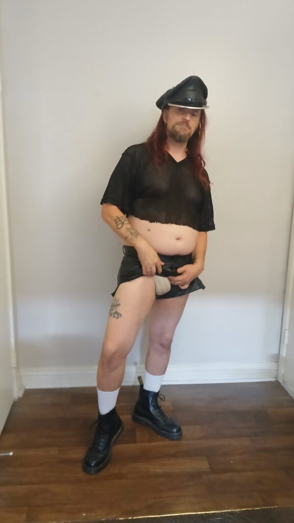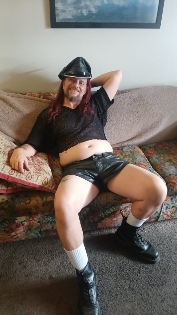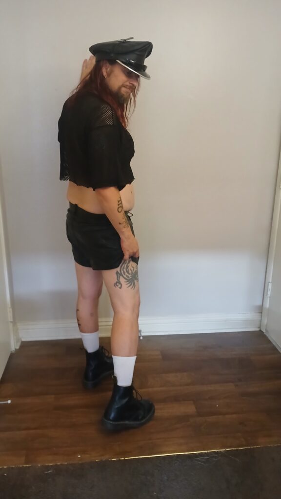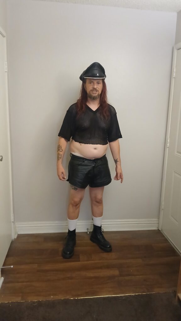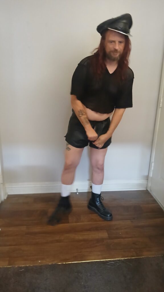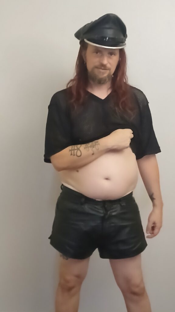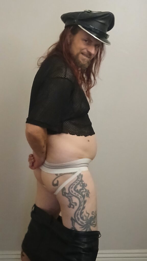 While I have the advantage of having someone else to push the button for me, here I am in my muir cap and leather shorts preparing to shoot the scene with Slave JJ in the straight jacket later that afternoon.