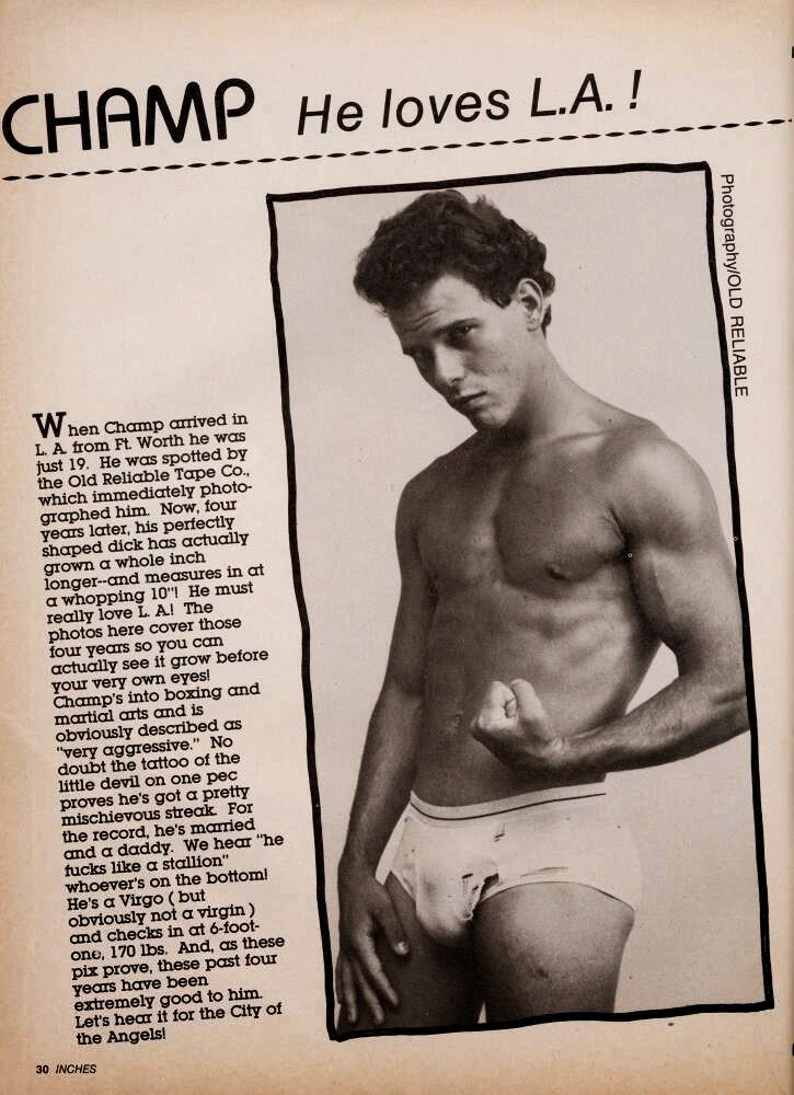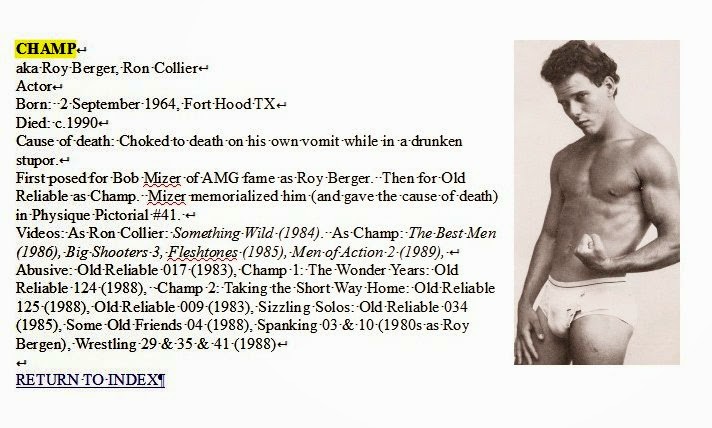 Roy Bergen lit out for Los Angeles at 19 in 1980, renamed himself Champ, became a favorite model of Bob Mizer and David Hurles, posed for well over 100 photos published by Old Reliable, and died before the age of 30 in 1990.