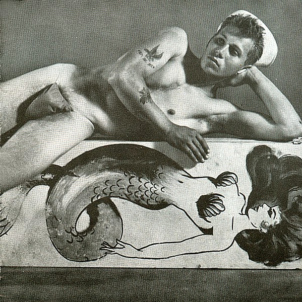 Tattooed sailor and 50s hustler Harry Heflin poses nude with a painting of a mermaid for Kris of Chicago