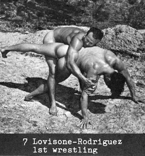 Pepper Gomez wrestling in the desert with Bill Brinkley in front of Bruce of LA’s camera in the 1950s.