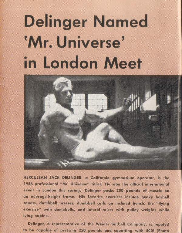 50s bodybuilder Jack Delinger took Mr California 1948, Mr. America 1954, Mr. Universe 1958, and the cover of most of the fitness magazines of the late 40s to mid 50s… Here he is photographed by Russ Warner, Bob Delmonteque, Lanza, and others.