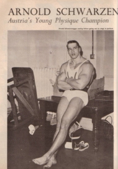 Actor and bodybuilder Arnold Schwarzenegger featured in 1960s bodybuilding magazines featuring photos by Hollfelder and Cameracraft.