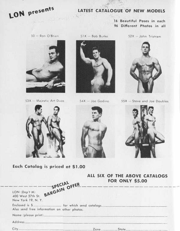 Tattooed mid-50s vintage physique model Frank Lombardo went from rough trade hustler on the streets of New York to modeling for Vulcan, Jack Sydney, Anthony Guyther, Bob Anthony and Kris.