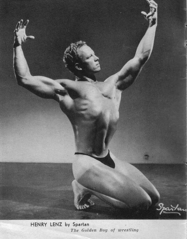 Mr. Muscle Beach 1952, wrestler “Golden Boy” Henry Lenz almost never won on the wrestling mat on TV, but posed successfully for AMG, Spartan, and Bruce of LA in the bodybuilding magazines.
